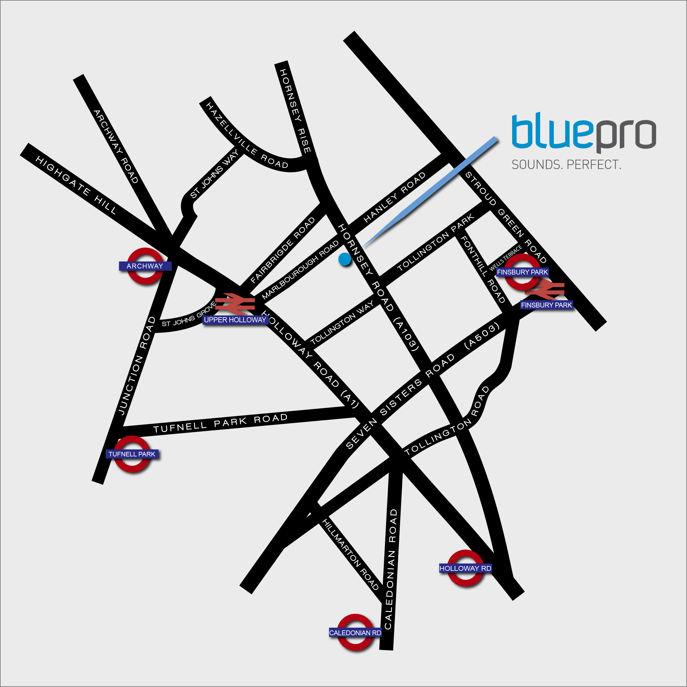 Leave the station and turn right to walk down Highgate Hill and onto Holloway Road. Walk down for approximately five minutes before taking a left onto Marlborough Road. At the end of the road turn right onto Hornsey Road. Walk a further 30 metres up the road and on your right you will see large green gates with 407 in large red letters. Our entrance is immediately on the right as you walk through the gates.