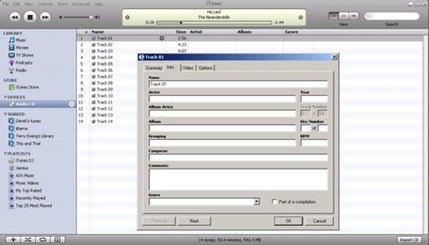 On the Info tab, type in track name, artist name, album name, select a genre and year of release. The next button will take you to the next track. Continue until all tracks are titled.
